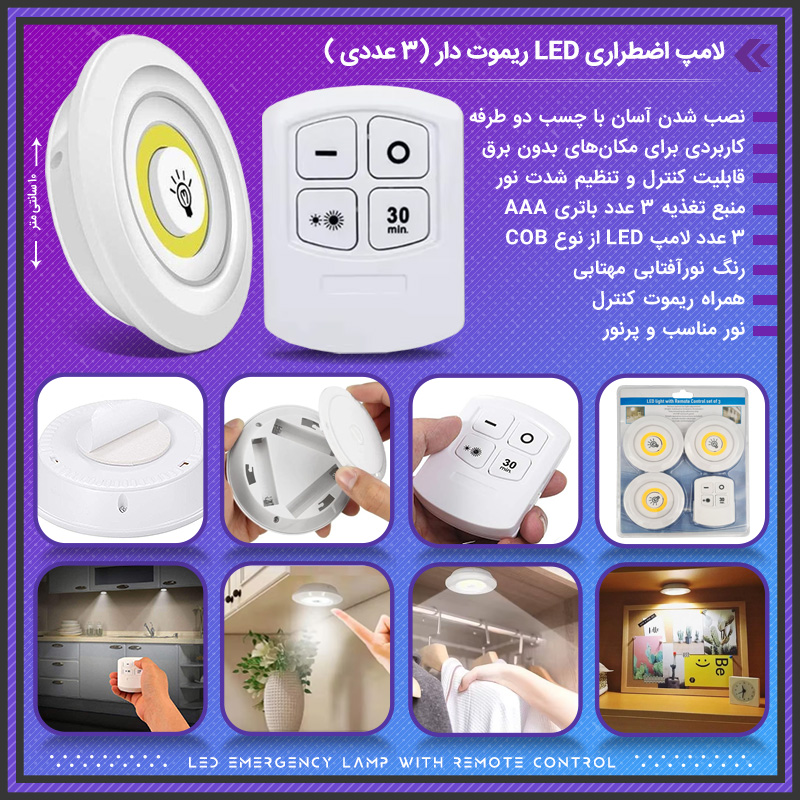 این پک لامپ LED شامل سه عدد لامپ اضطراری LED به علاوه یک ریموت کنترل است که میتوان آن را در سقف یا دیوار نصب کرد و هنگام قطع برق به عنوان چراغ اضطراری از نور آن بهره برد.  این لامپ ها هر کدام با سه عدد باطری نیم قلمی AAA کار میکنند و توسط دکمه روشن خاموش روی لامپ و یا ریموت همراه آن قابل کنترل است. یکی از مزایای چراغ اضطراری سقفی دیواری ریموت دار مدل 3in1 داشتن حالت 30 دقیقه‌ است. به این صورت که با فعال شدن این حالت، چراغ ها بعد از 30 دقیقه به طور خودکار خاموش می‌شوند.  از ویژگی های این چراغ سه حالته بودن لمسی و ریموتی و تایمر دار می باشد و همچنین شدت نور لامپ ها در دو نوع شدید و ملایم قابل تغییر است. این مجموعه شامل سه عدد چراغ COB LED با نوردهی بسیار بالا و یکنواخت است که هر یک از آن‌ها دارای قابلیت تنظیم شدت نور در دو حالت ۲۰ لومن (کم نور) و ۴۰ لومن (پرنور) می‌باشند. این قابلیت به شما امکان می‌دهد تا میزان روشنایی را بسته به نیاز خود تنظیم نمایید.